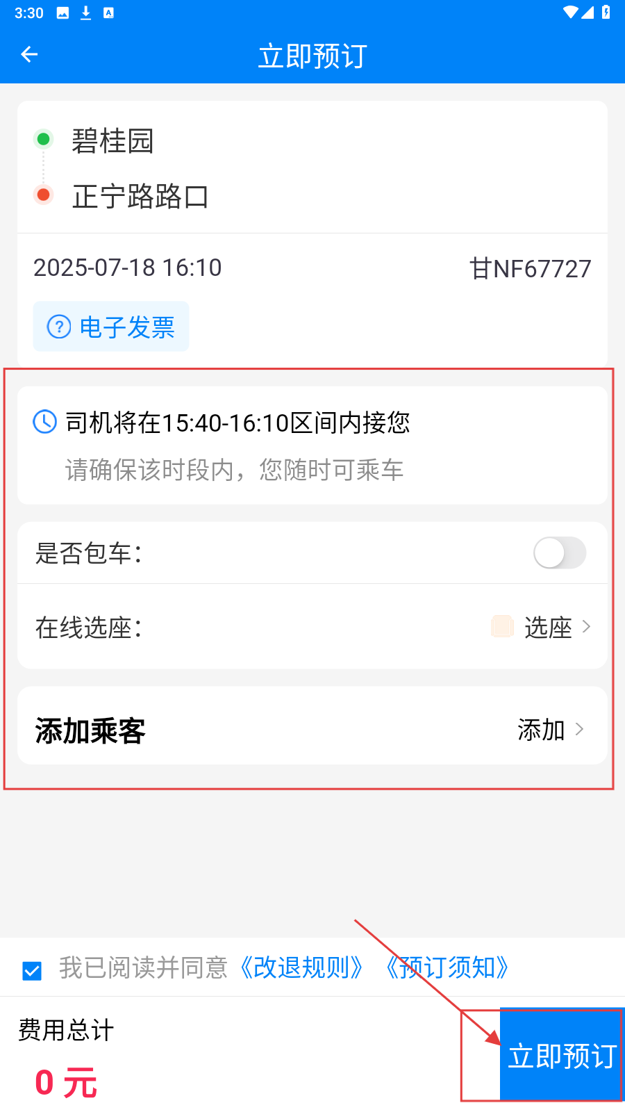 4、在立即预订页面,确认行程信息,按需选择包车、选座等,点击【立即预订】即可。
