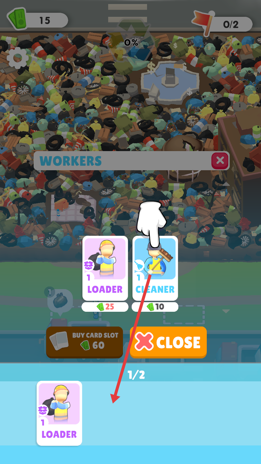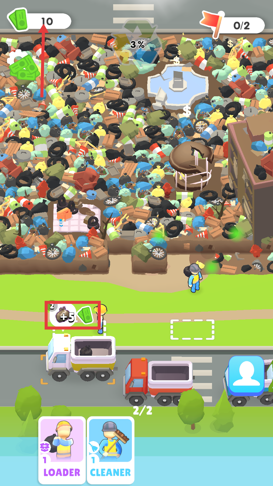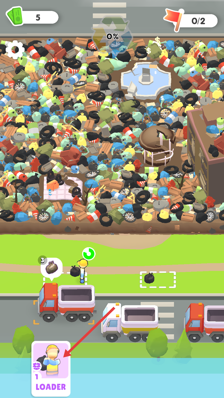 2、在垃圾场场景,派【LOADER】工人到垃圾点,按指引收集垃圾装入对应卡车,推进回收进度。
