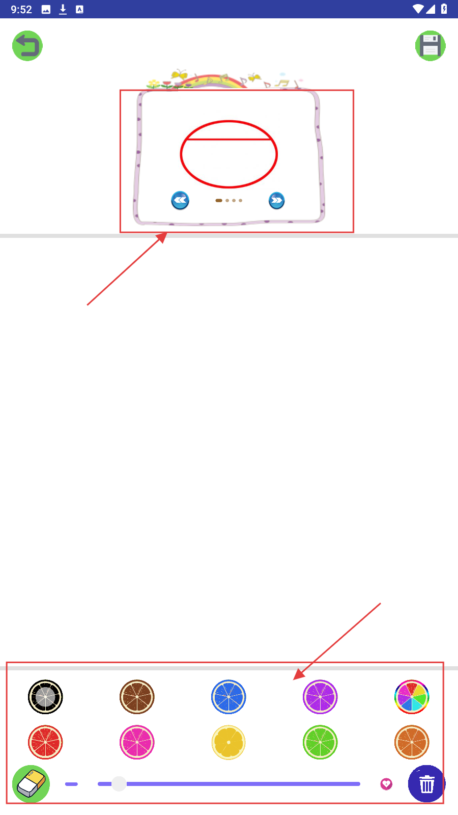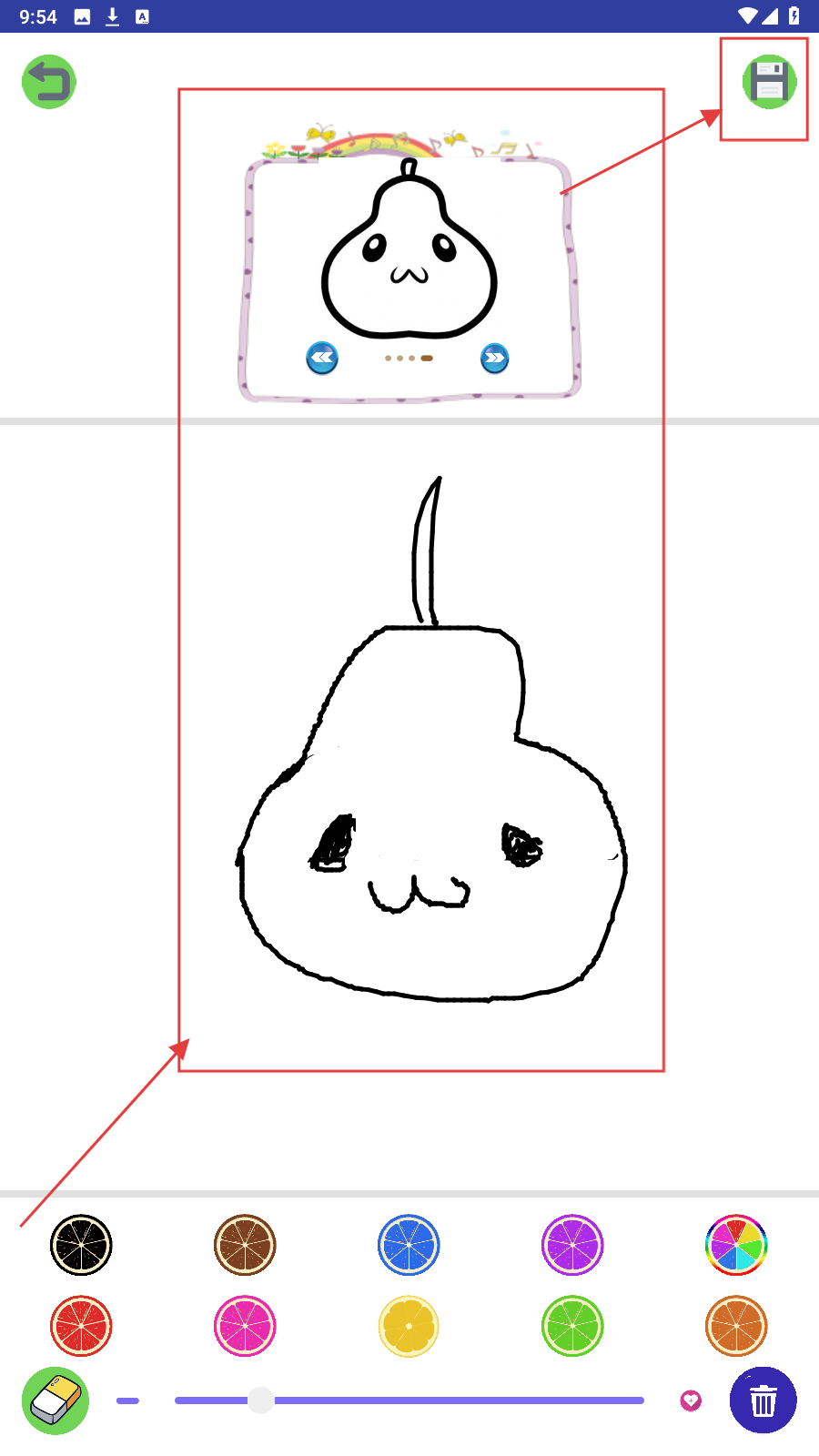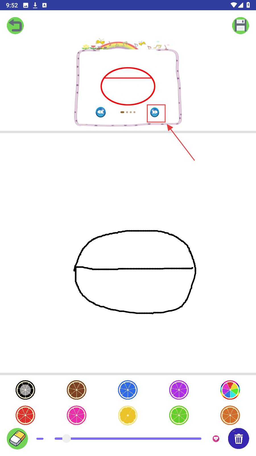 2、进入画画页面,在下方可以选择喜欢的颜色画笔进行创作,跟随上方图案分解一起画。