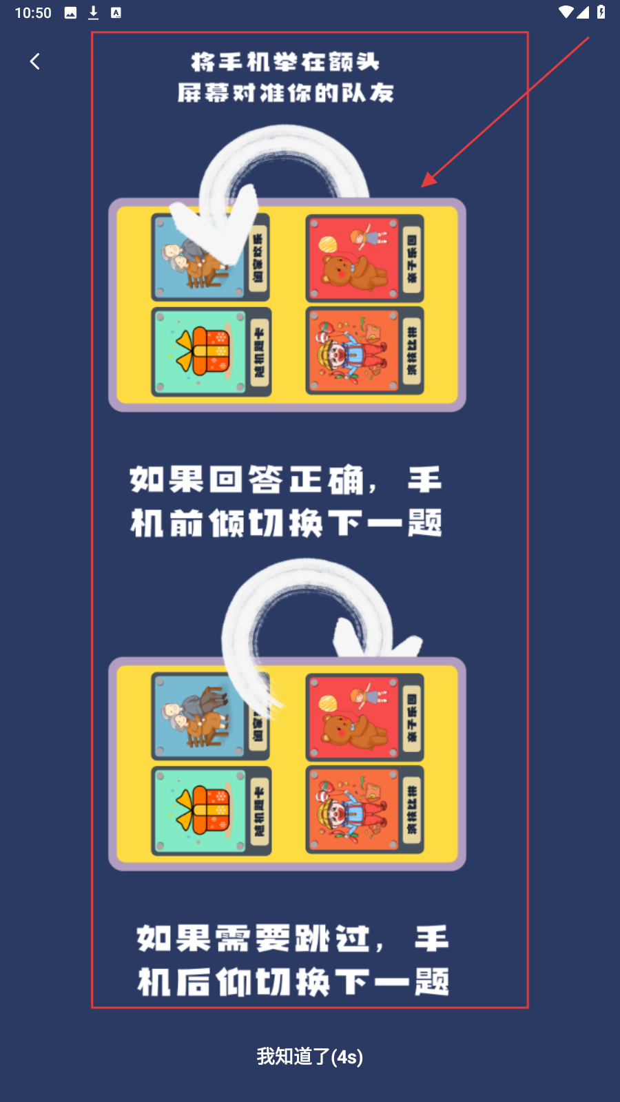 4、将手机举在额头,屏幕对准队友,按提示切换题目,完成游戏。