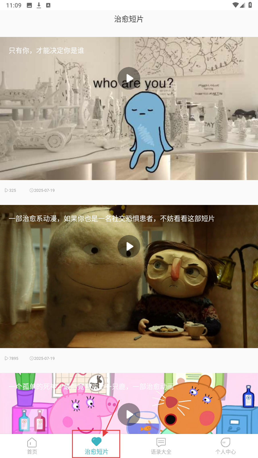 4、点击底部【治愈短片】,进入治愈短片页面,观看各类治愈系动漫短片。