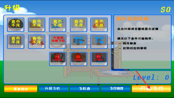 2、升级界面优先攒金币,暂无法升级时直接点【开始飞行】,积累飞行收益。