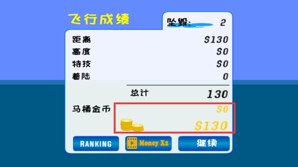 4、坠毁后看成绩,金币可攒着升级,或看广告翻倍,点击【继续】重开挑战。