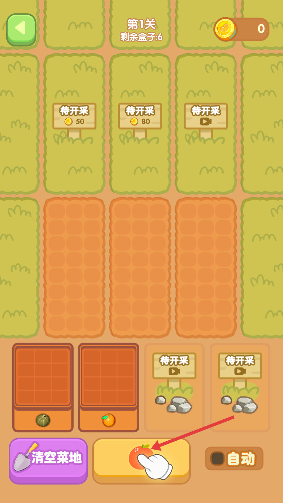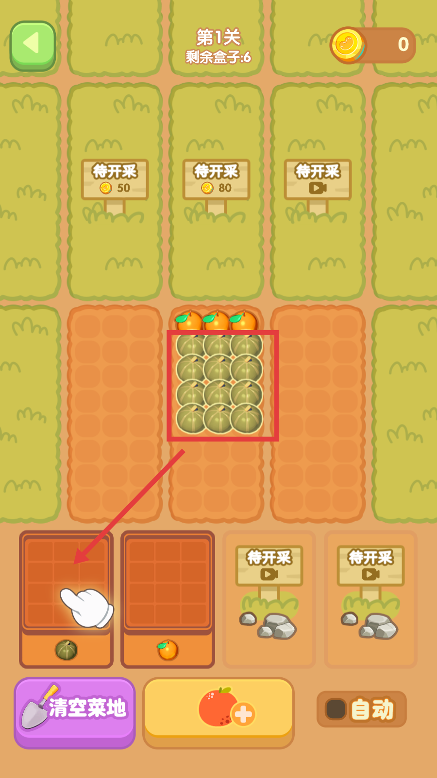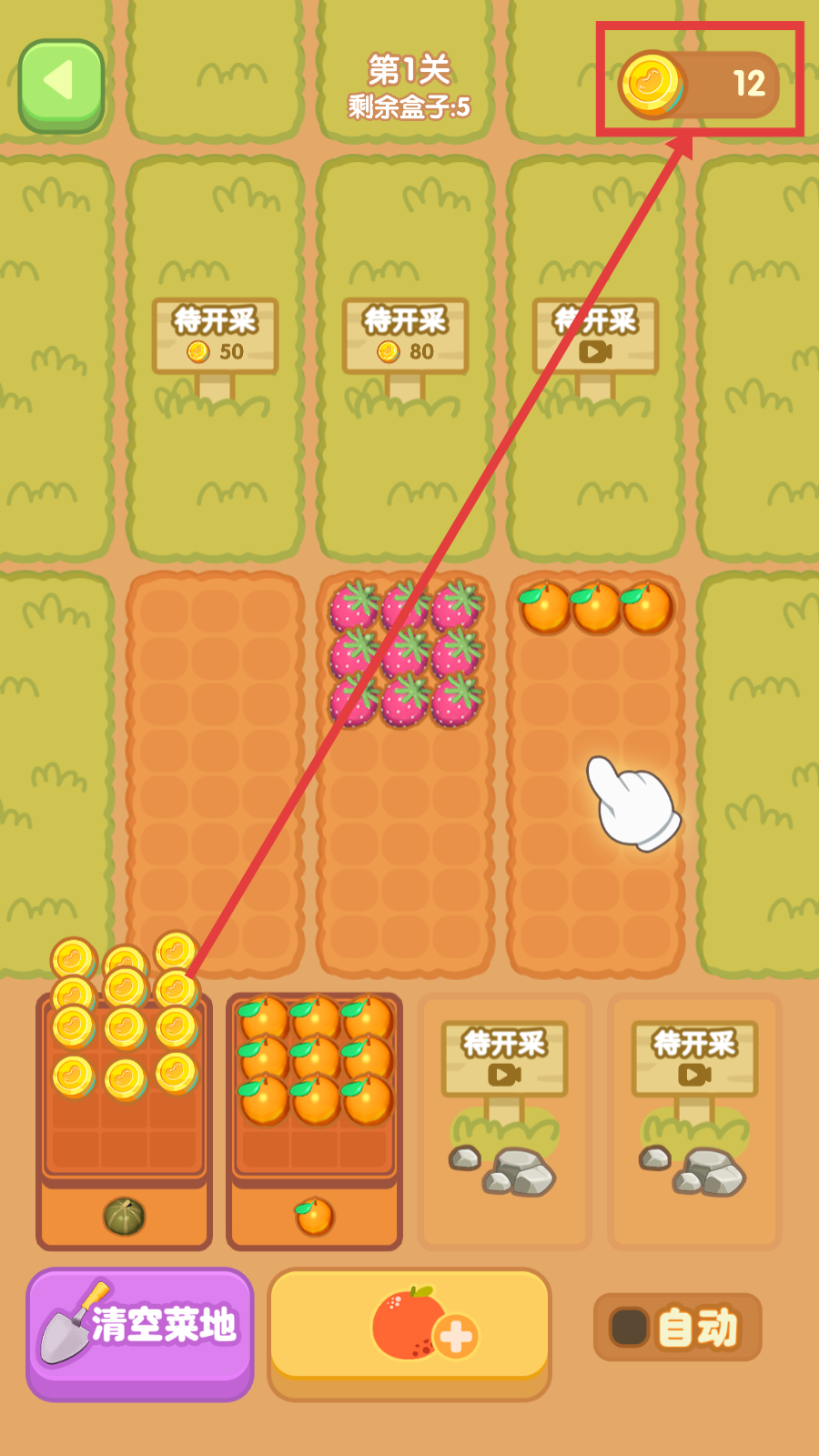 4、消除水果,获得金币,优先解锁“待开采”地块,扩大种植区,提升金币获取效率。
