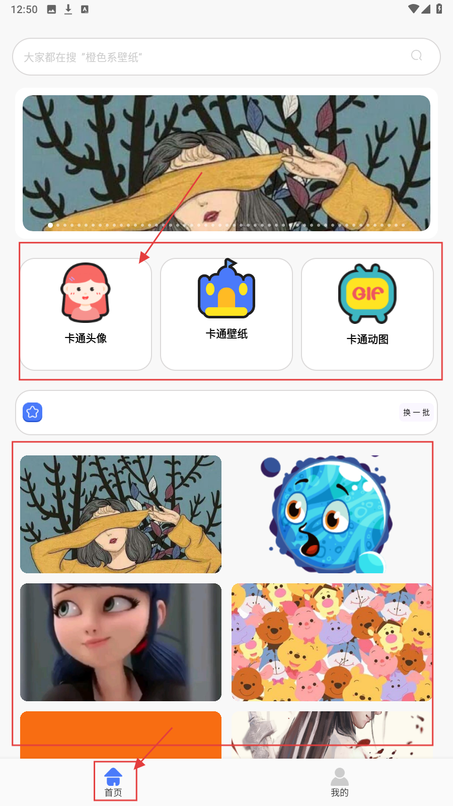 1、进入首页,可选择【卡通头像】【卡通壁纸】【卡通动图】等分类,浏览不同类型卡通内容。
