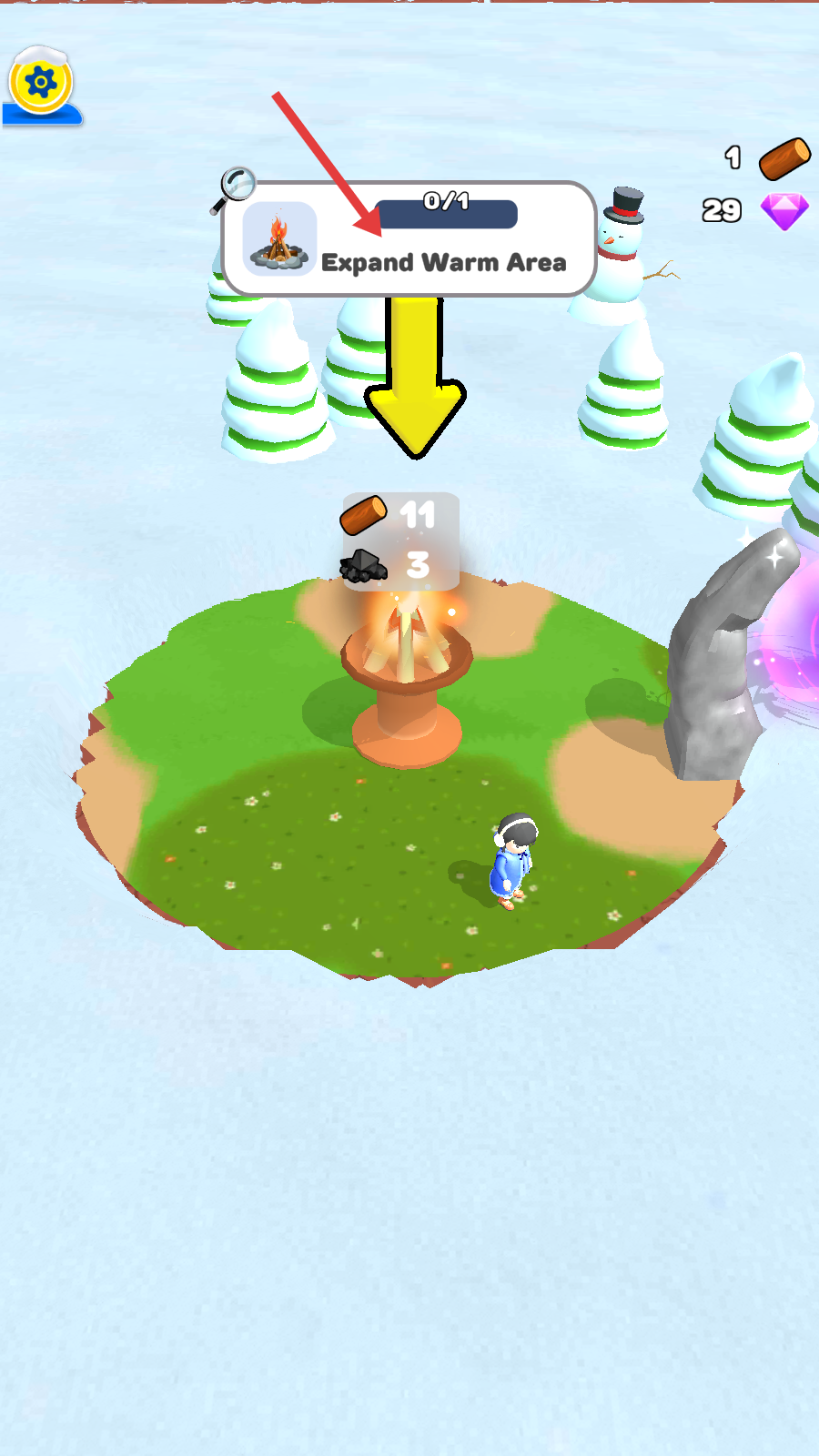 1、收集11木材、3煤炭,点击篝火完成【ExpandWarmArea】,扩大温暖范围。