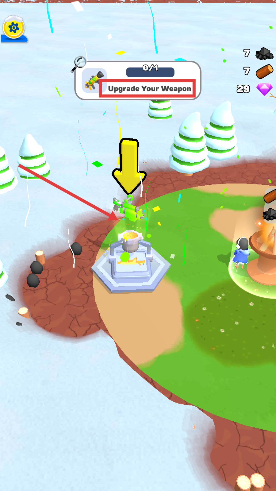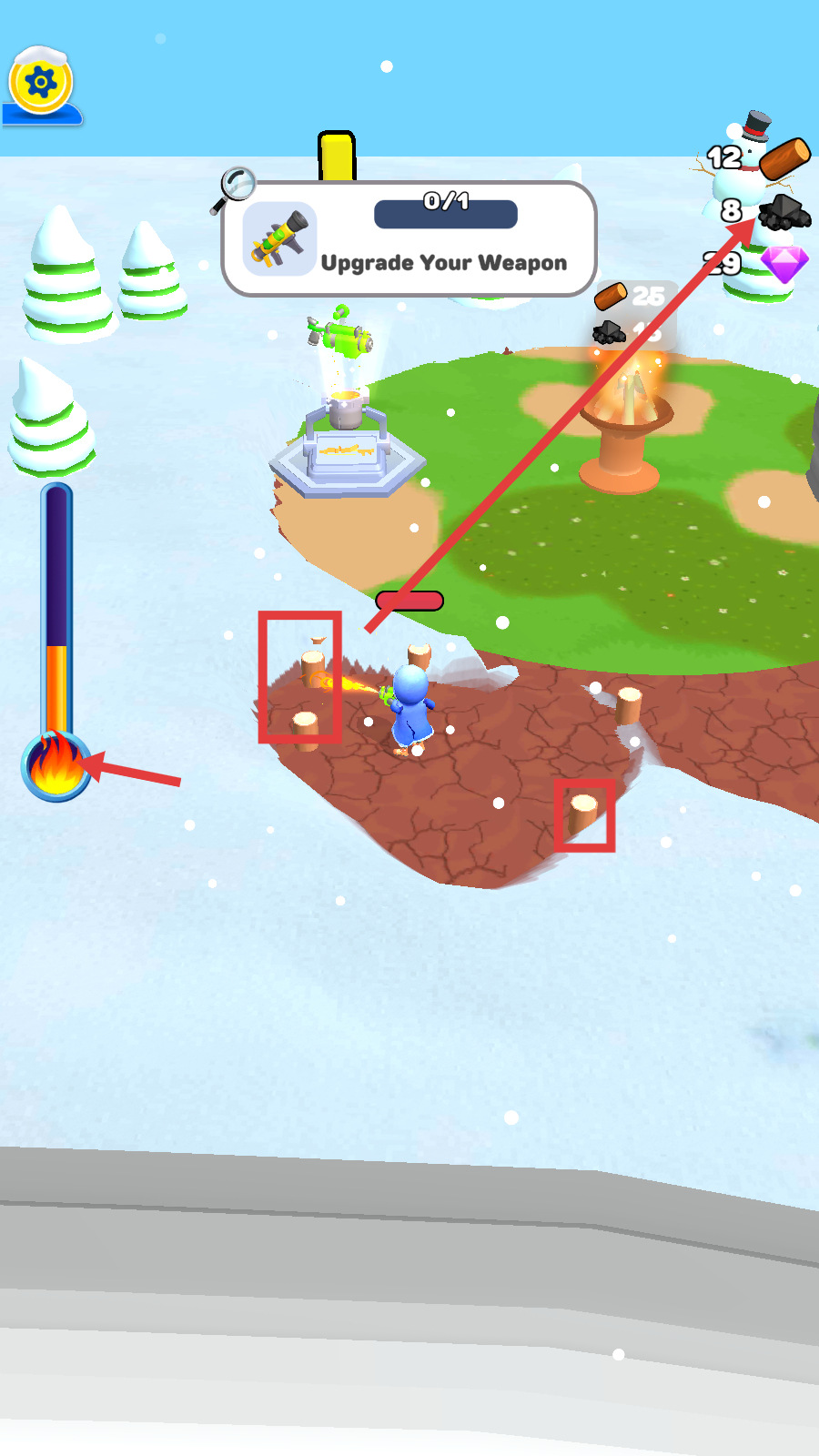 2、用武器破冰,收集木材、煤炭,注意温度条,前往武器升级建筑推进任务。