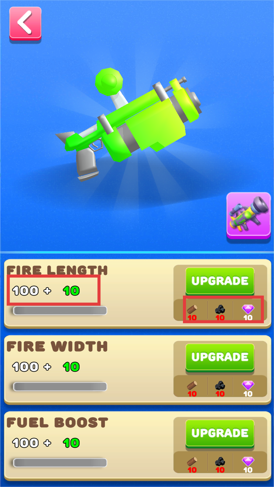 4、在升级界面,确认材料足够,点击【UPGRADE】提升喷枪射程、宽度等属性。