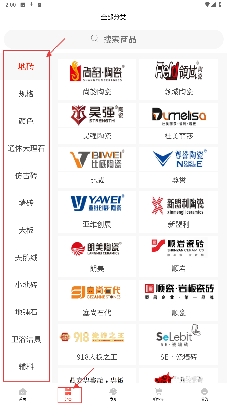 1、进入分类页面,可选择地砖、规格、颜色等分类,或选择【尚韵陶瓷】【领域陶瓷】等品牌,浏览相关商品。