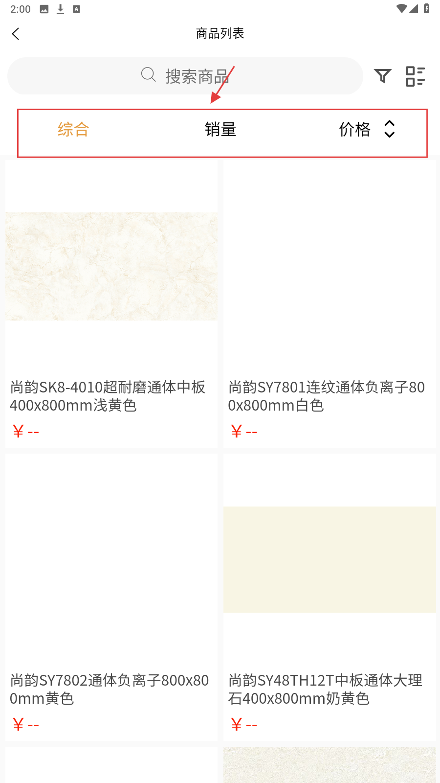 2、在商品列表页面,可按综合、销量、价格排序,查看不同排序下的商品列表。