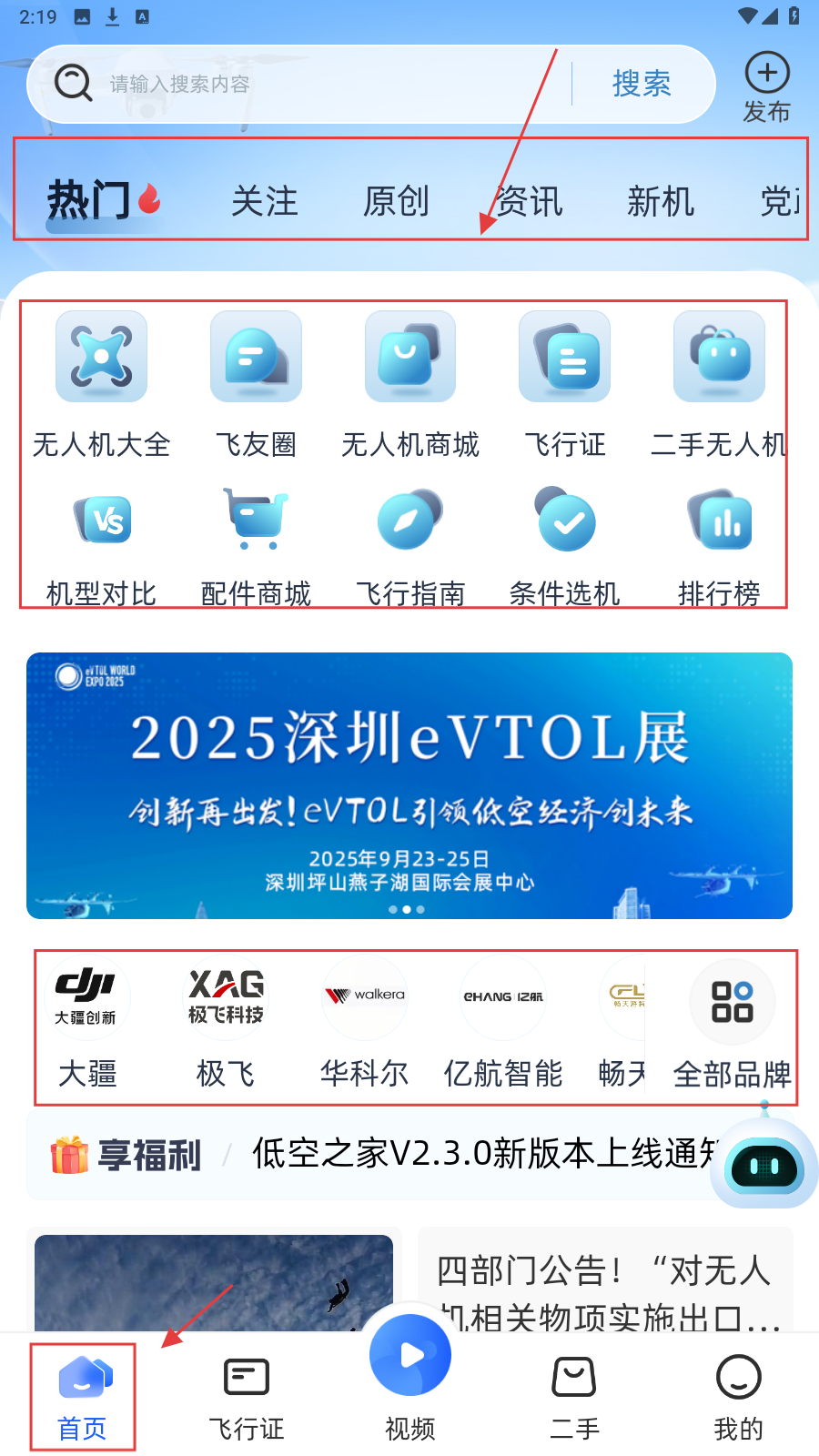 1、点击底部【首页】,进入首页,可选择【无人机大全】【飞友圈】等功能。