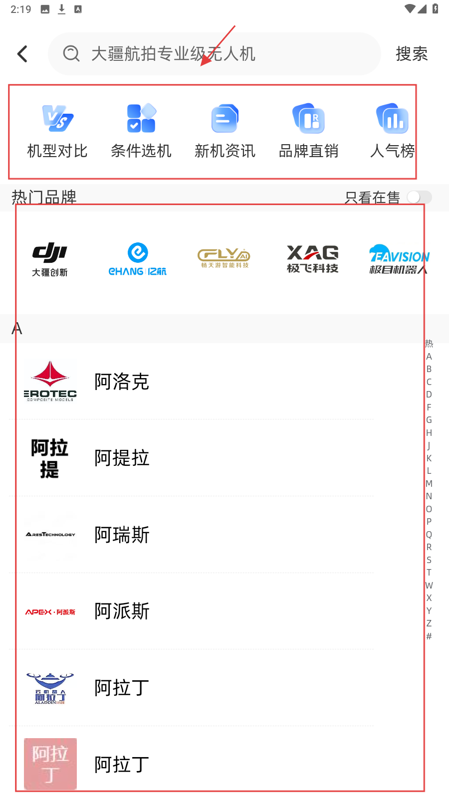 2、在搜索页面,可选择机型对比、条件选机等功能,或选择【大疆创新】【极飞科技】等品牌,浏览相关商品。
