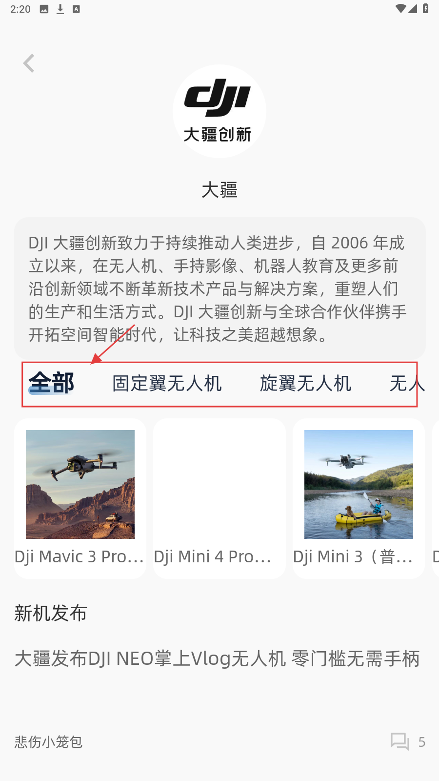 3、进入【大疆创新】页面,可选择固定翼无人机、旋翼无人机等分类,查看不同分类下的商品列表。