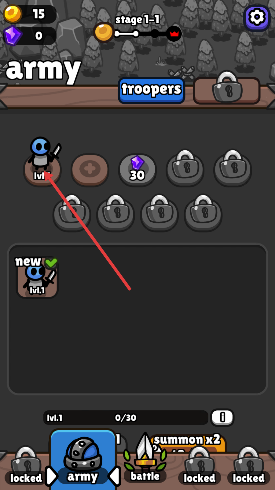 2、进入【army】界面,点击剑士图标,查看部队状态,为战斗配置兵力。
