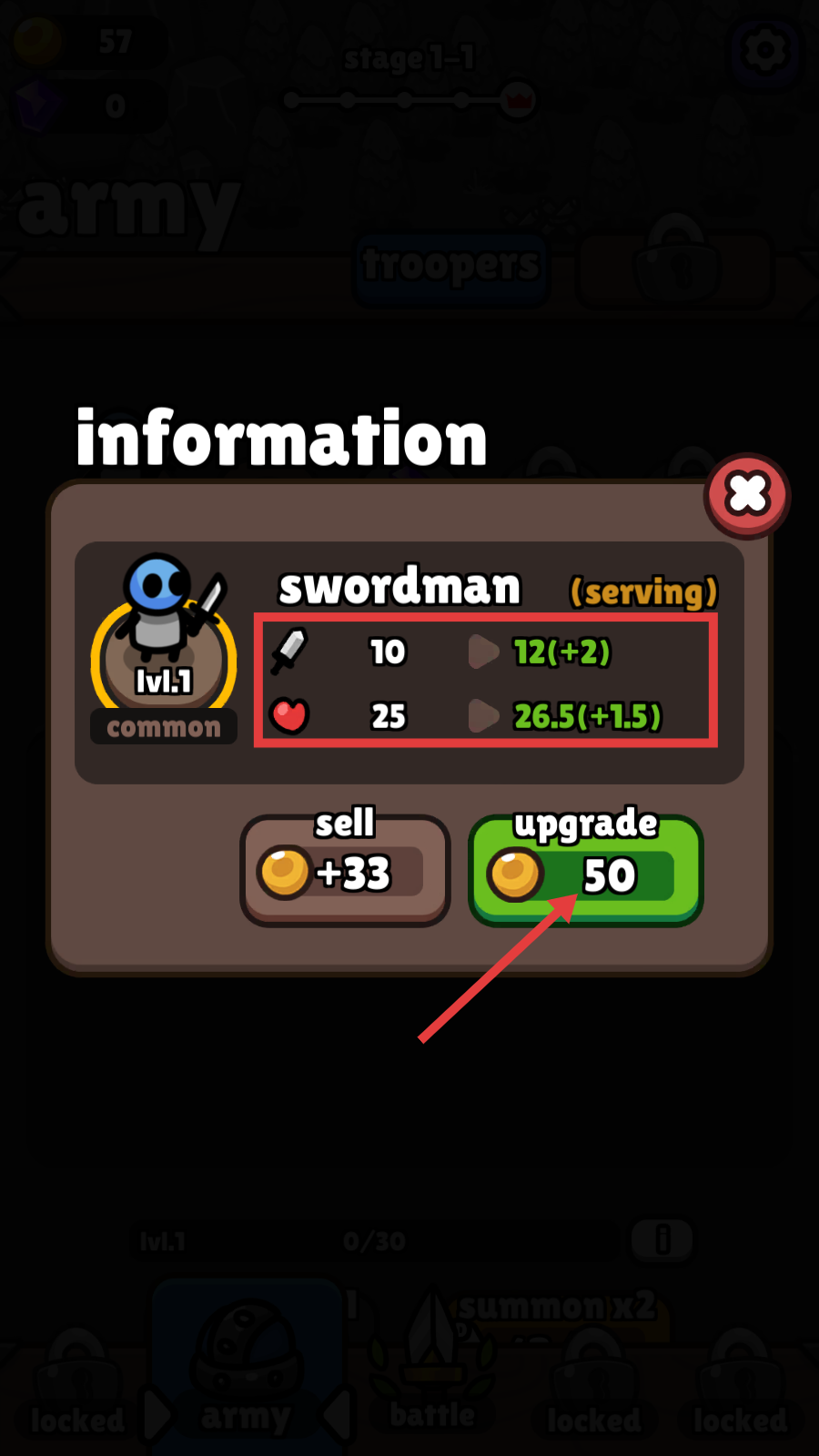 3、在剑士信息页,若金币够50,点upgrade升级,提升【swordman】攻击与生命属性。