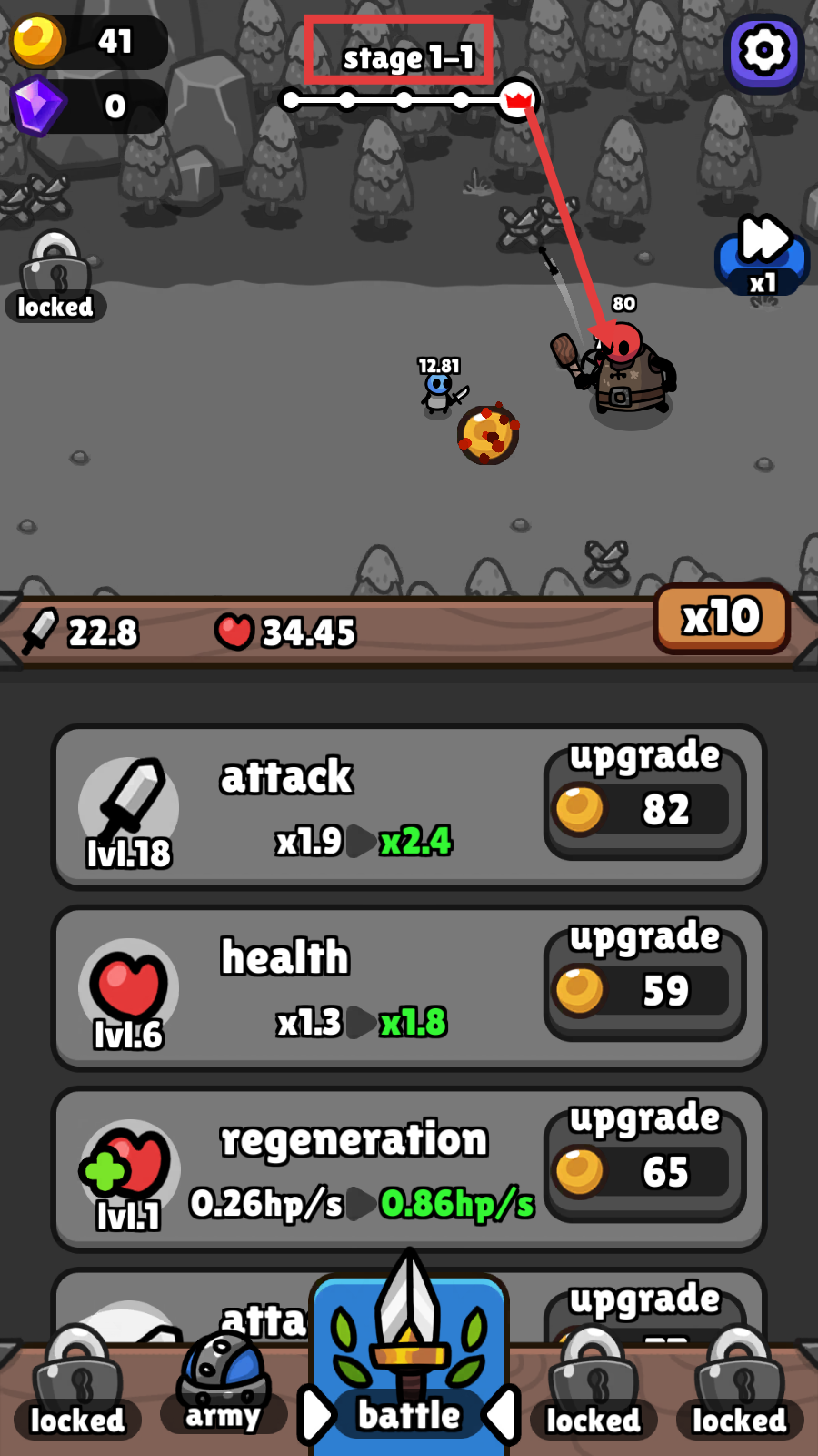 1、战斗准备时,金币充足就点【attack】旁upgrade,花7金币提升攻击,增强输出。