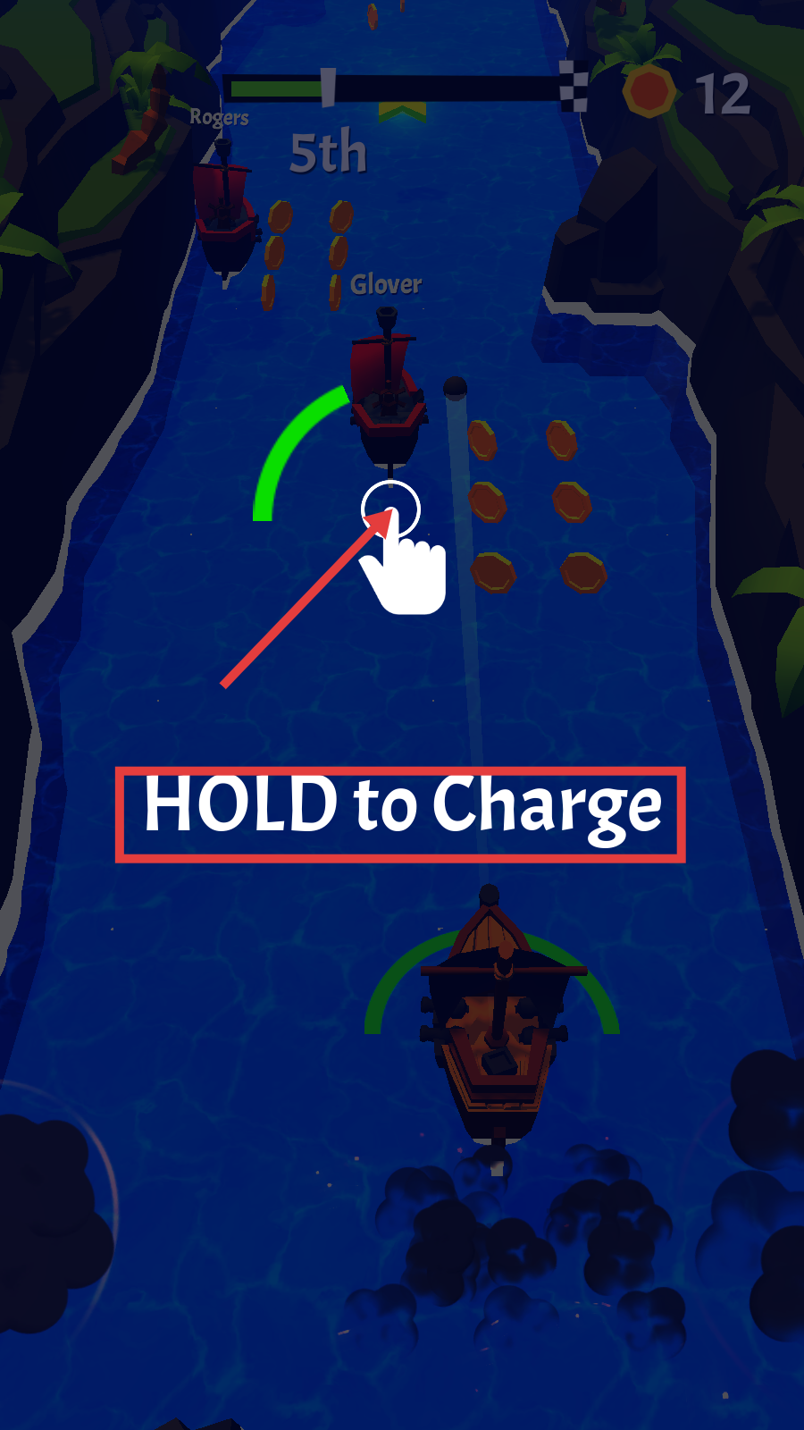 2、比赛中遇其他船,长按【HOLD-to-Charge】蓄力发射炮弹,攻击对手,抢占赛道。