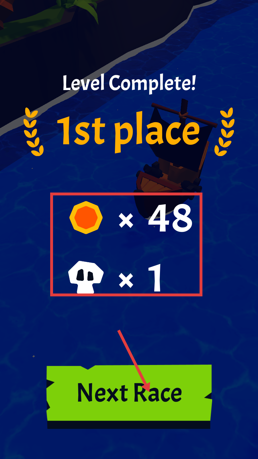 4、冲过终点获第1名后,点击【Next-Race】进入下一关,积累金币和道具强化船。