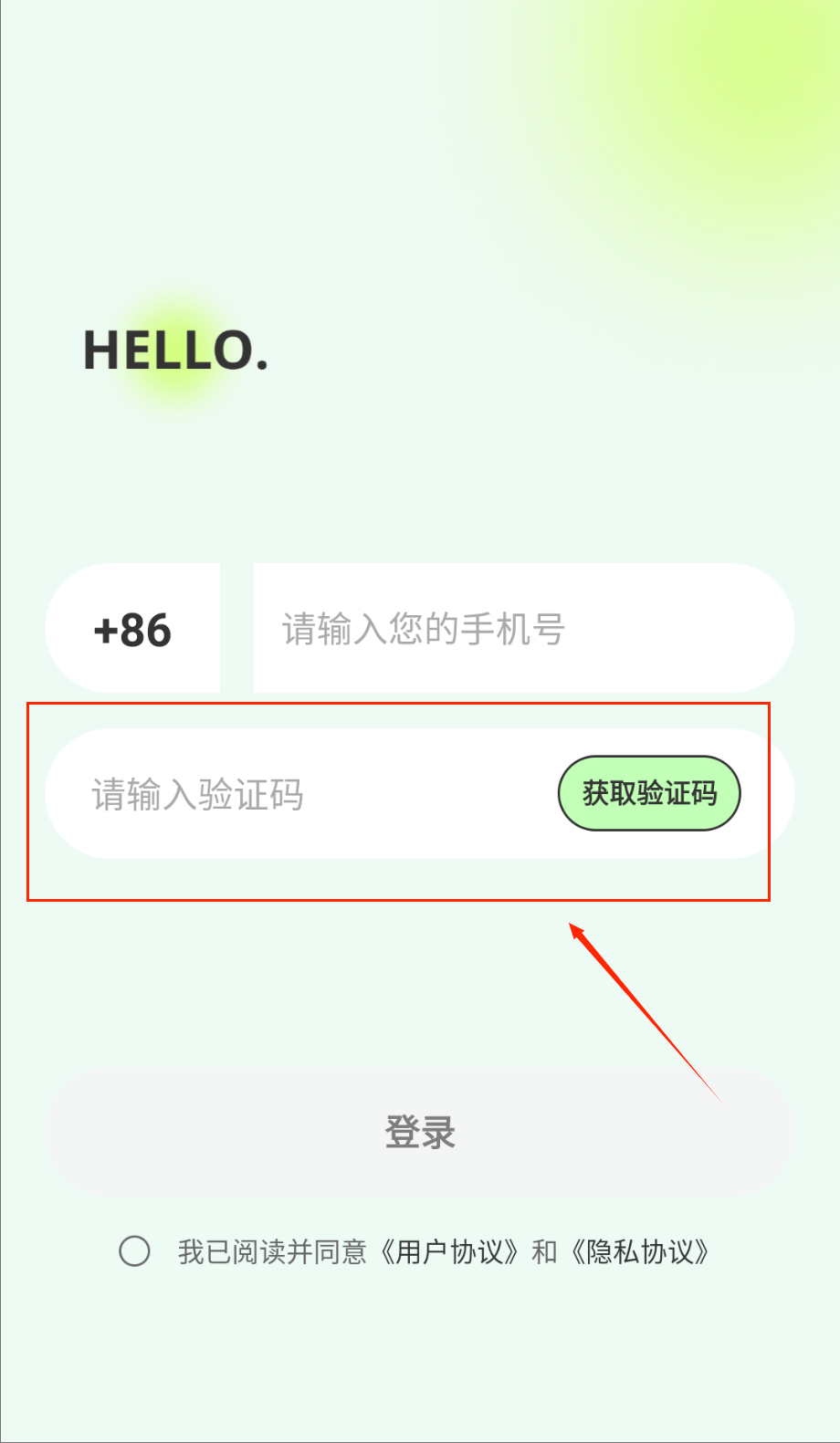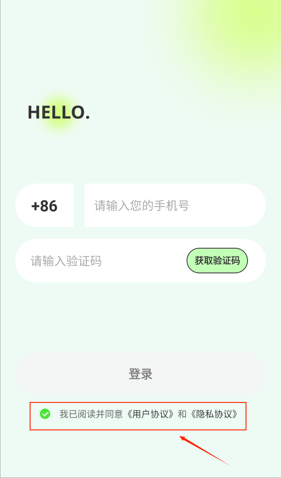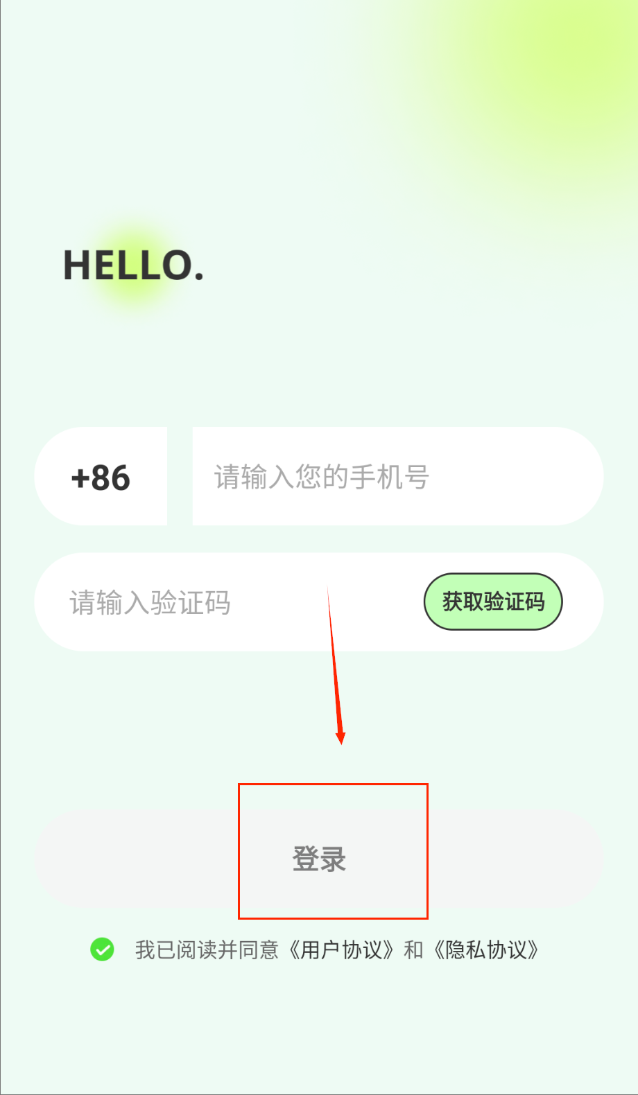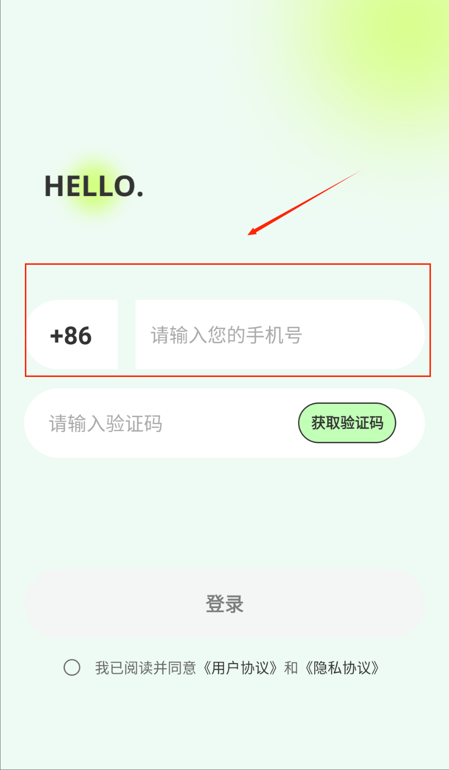 1、打开APP会看到浅绿色背景的登录页,在"HELLO."下方的输入框填写手机号,注意核对号码是否正确呀。