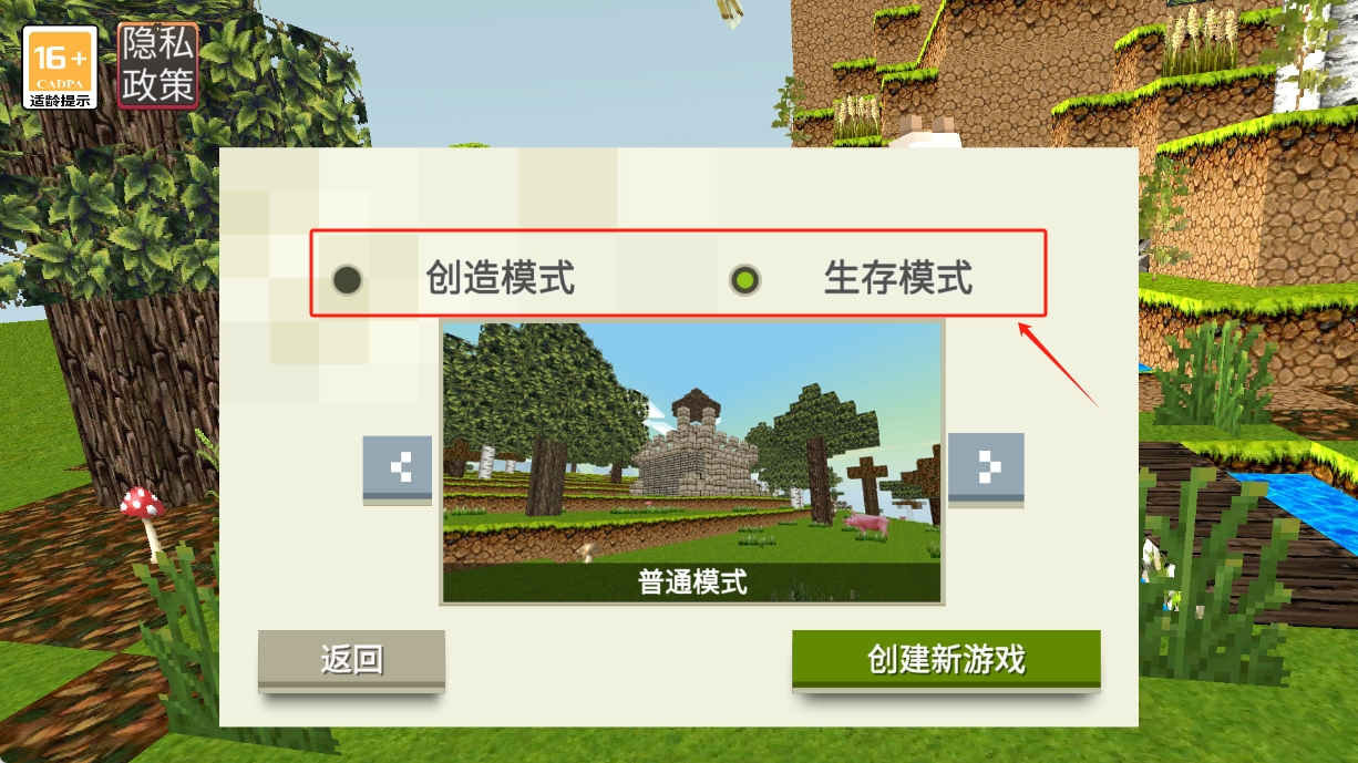 4、如何选择游戏模式?在模式选择界面点击“创造模式”“生存模式”或“普通模式”之一,即可选定并开始游戏。