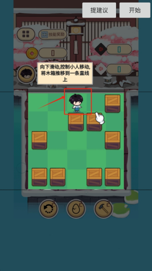 2、根据提示,向下滑动屏幕控制小人移动,将木箱推到一条直线上。