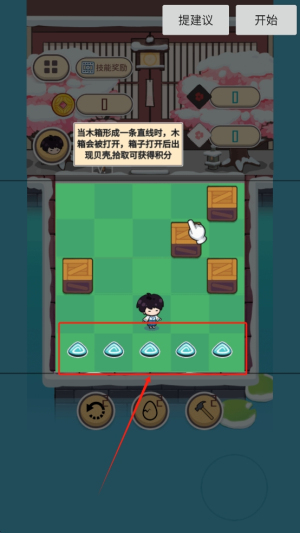 3、当木箱形成一条直线时,木箱会被打开,箱子打开后出现贝壳拾取可获得积分。