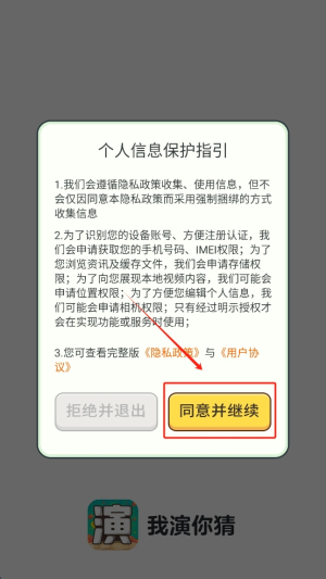 1、在“个人信息保护指引”页面,阅读指引后点击“同意并继续”以授权游戏访问权限。