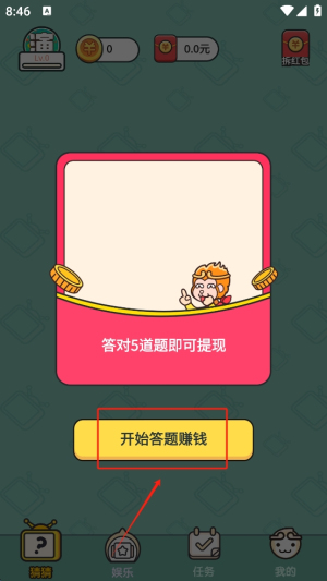 2、在游戏主界面,点击“开始答题赚钱”按钮进入答题环节。