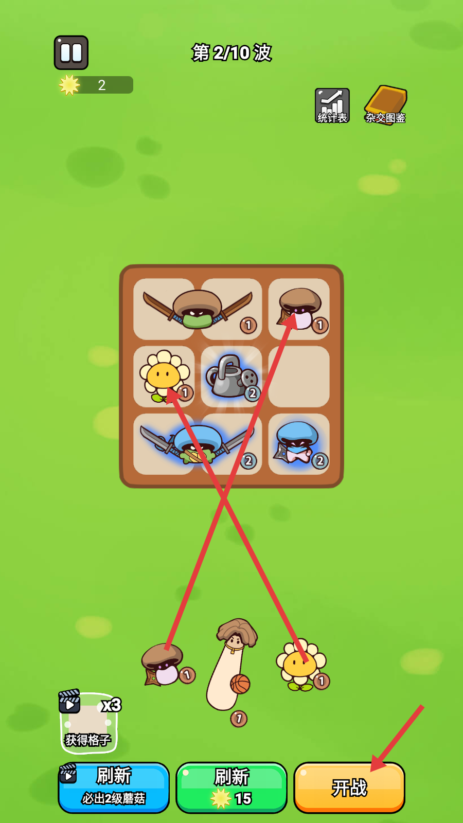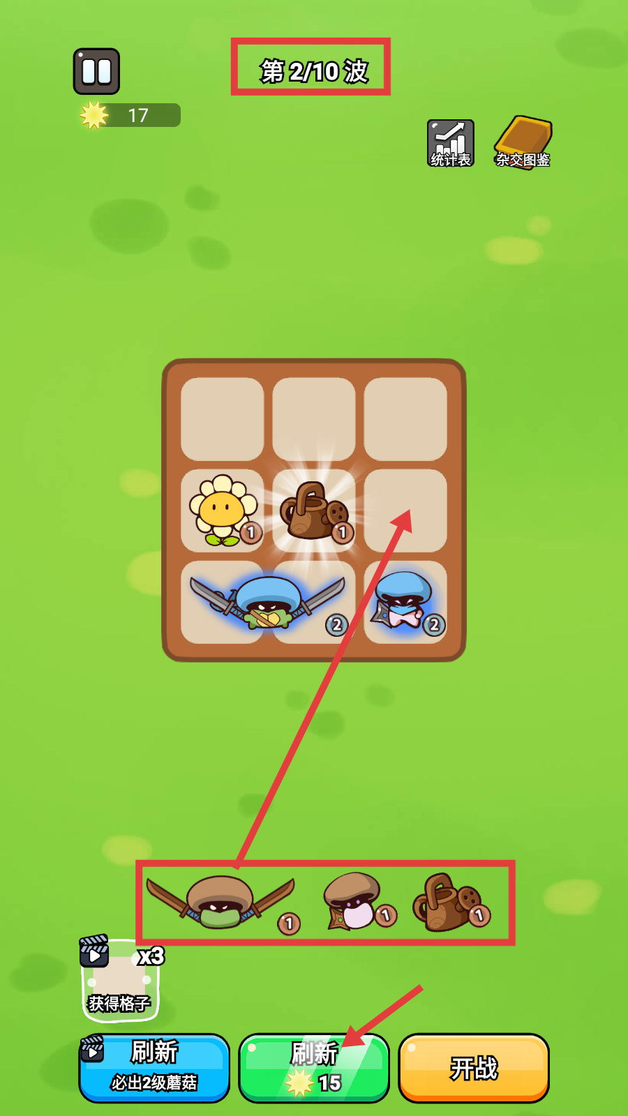 1、在【第2/10波】,花费10个【阳光】资源,点击【刷新】按钮,刷新出不同的植物,把各种植物安置在9格的阵地里。