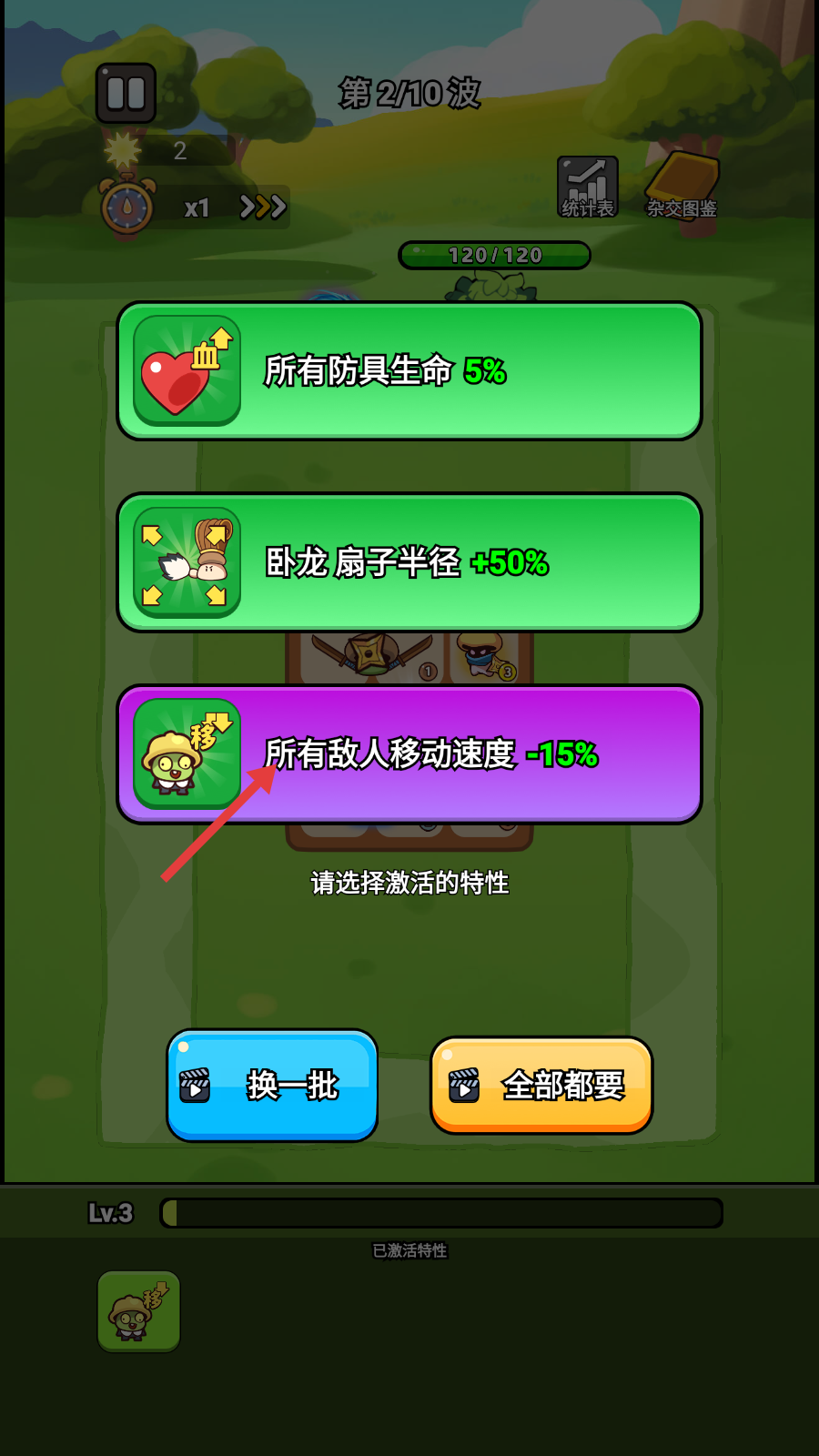 4、升级选特性,优先【所有敌人移动速度-15%】,延缓敌人推进,降低压力。