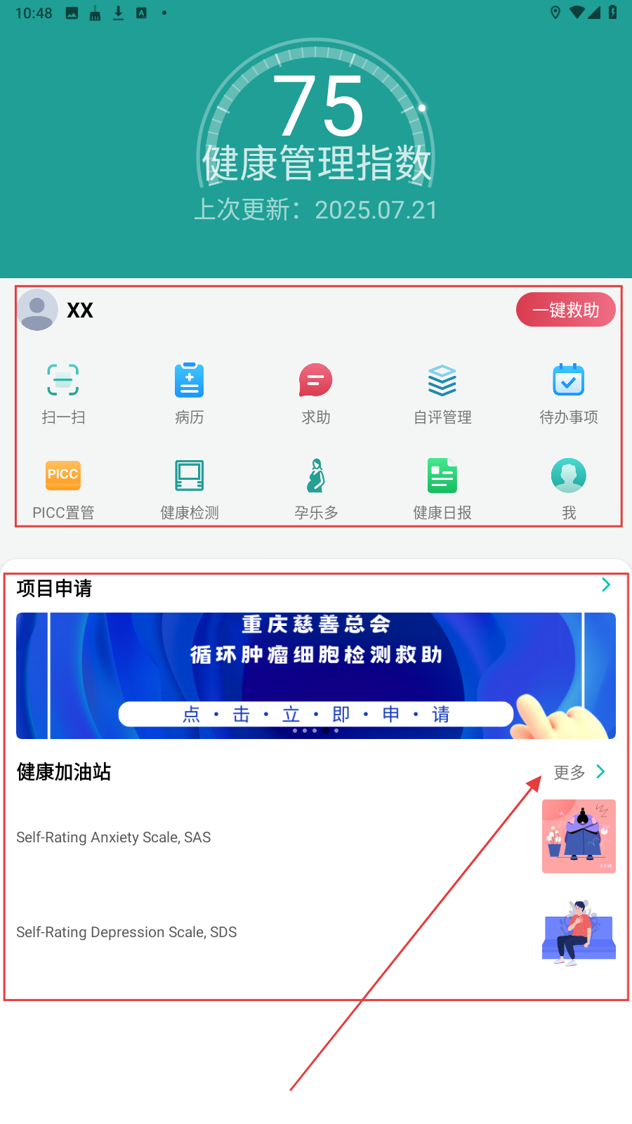 1、进入应用,在应用主界面有扫一扫、病历等功能按钮,下方还有项目申请、健康加油站等服务,点击【项目申请】右侧图标。