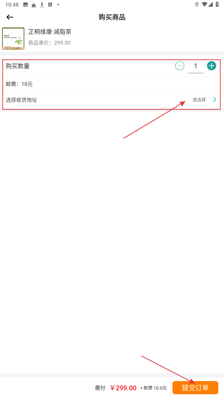 4、进入【购买商品】页面,选择购买数量以及收货地址,确认无误后点击【提交订单】即可。