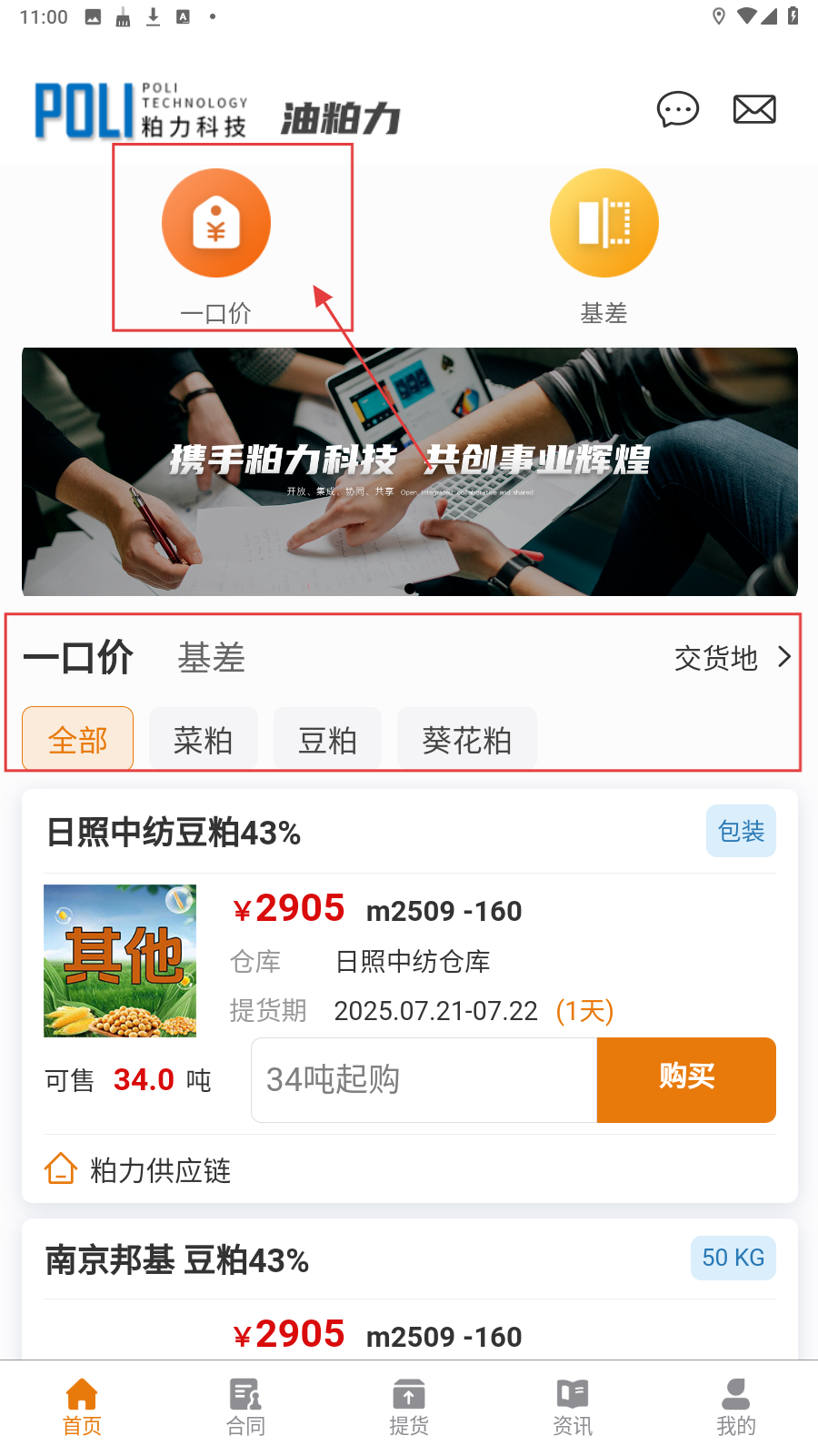 1、打开应用,在【首页】有【一口价】、【基差】服务按钮,点击【一口价】。