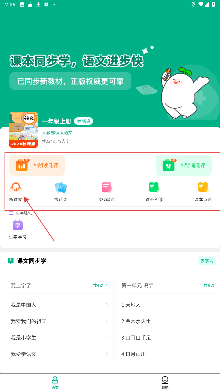1、在首页选择【听课文】按钮,进入课文学习页面,开始语文课文学习。