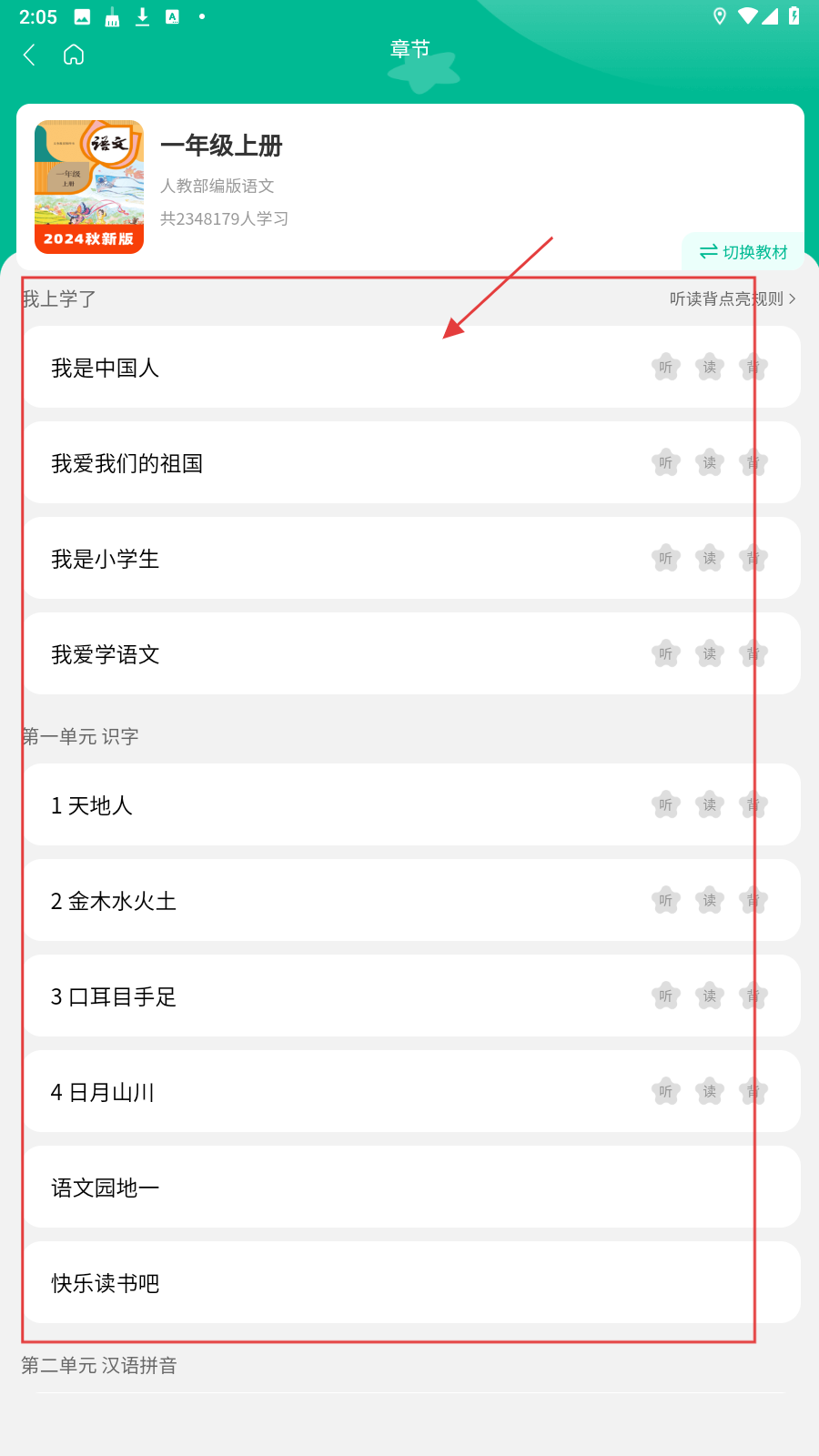 2、在课文学习页面,选择需要学习的课文,点击进入详情页面。
