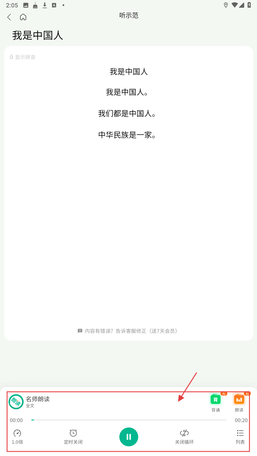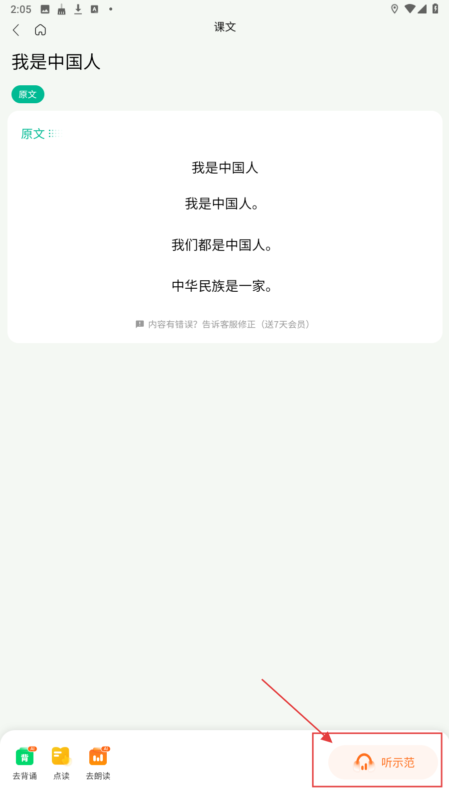 3、在课文详情页面,点击【听示范】按钮,听取课文示范朗读,学习正确发音。