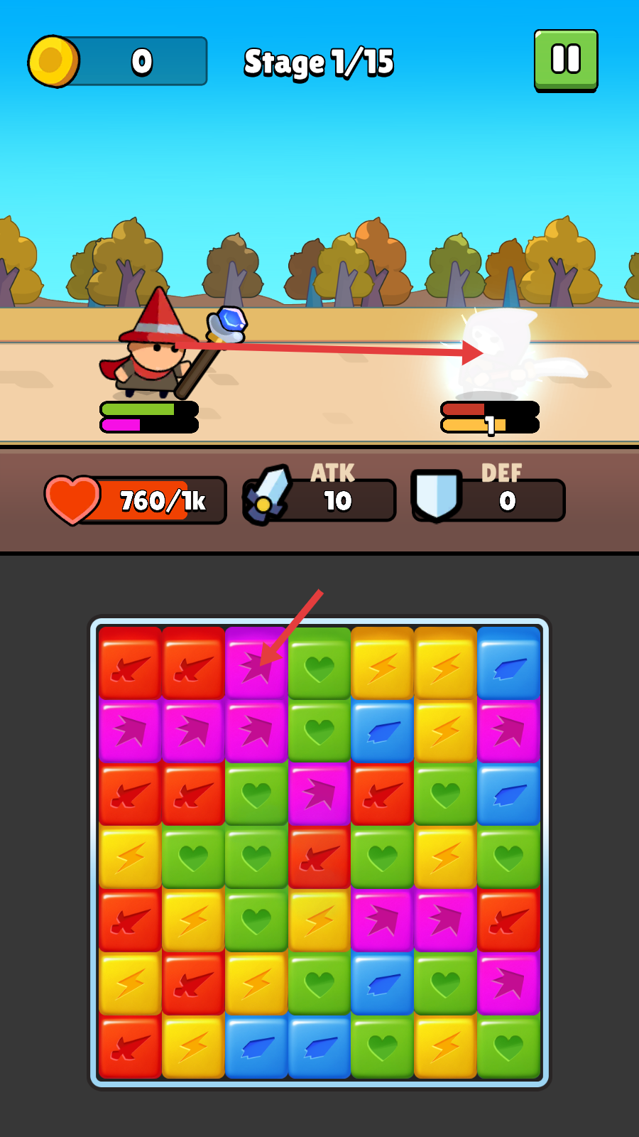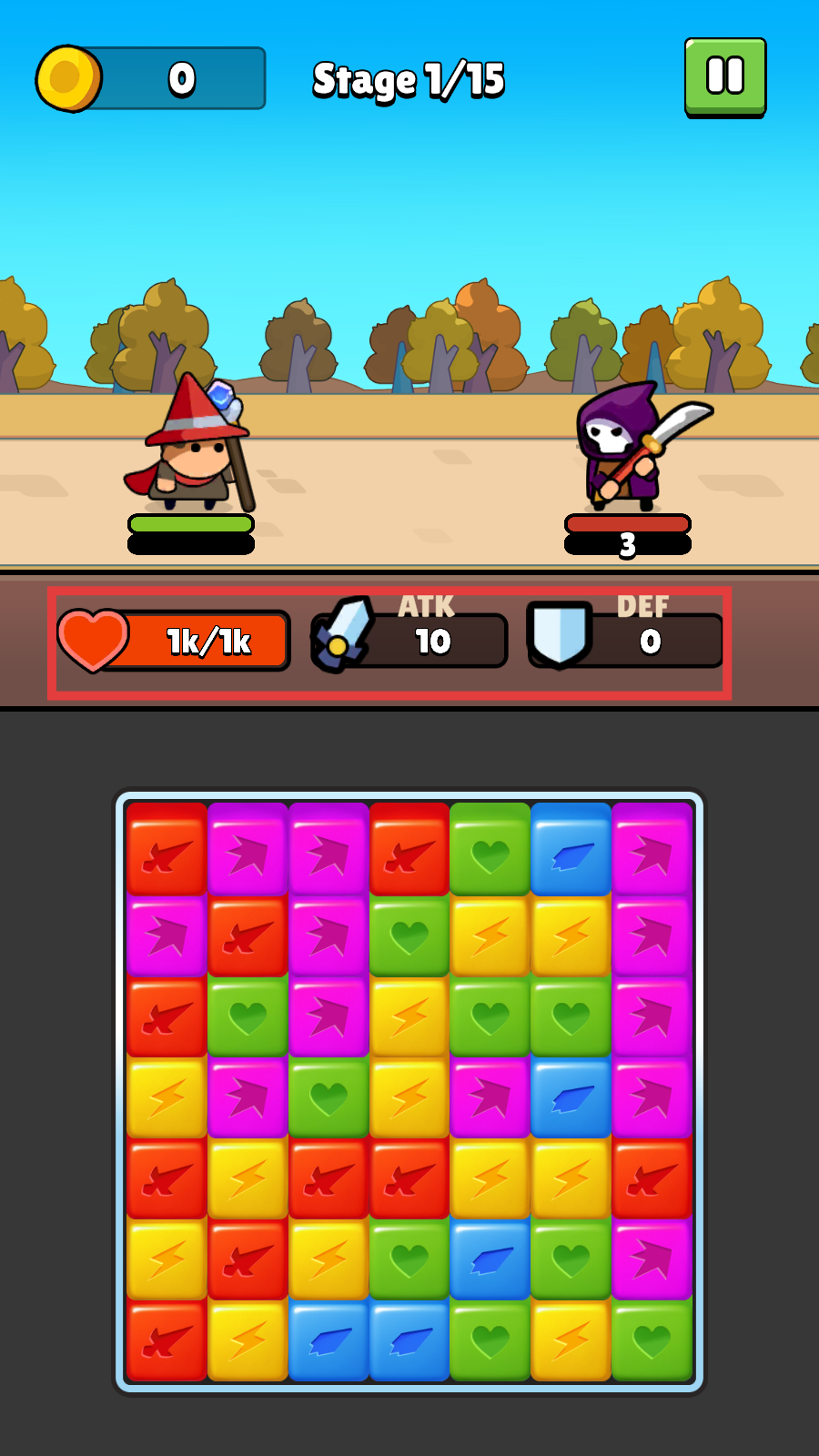 2、战斗时优先消除同色方块,借助特效提升攻击,应对敌方单位。