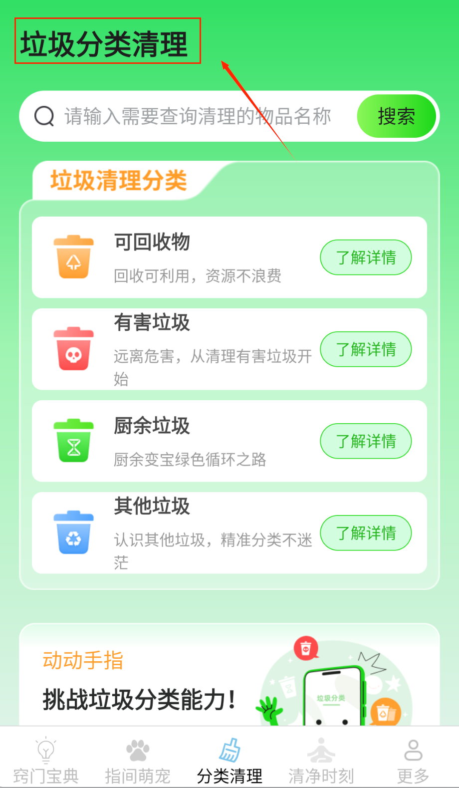 3、垃圾分类功能拍照识别垃圾类型,学习分类知识,参与环保挑战赢积分呀。