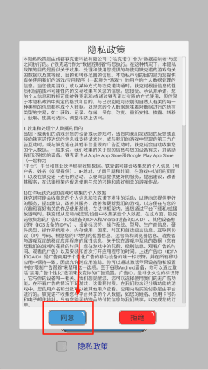 1、阅读并点击“同意”按钮,接受隐私政策,授权游戏收集必要数据。