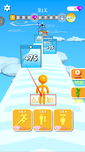 1、扮演橡皮人开始跑酷,在赛道上收集道具,道具能增加身高或提供临时加速,初步掌握跑酷节奏,感受身高变化带来的差异,熟悉玩法。