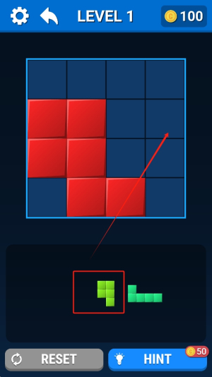 4、在游戏界面,拖动下方的方块到上方的网格中,填满红色区域即可完成关卡。