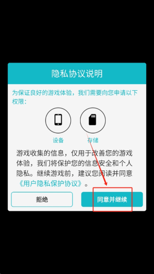 1、阅读并同意隐私协议,点击“同意并继续”按钮以接受条款并开始游戏。