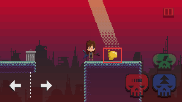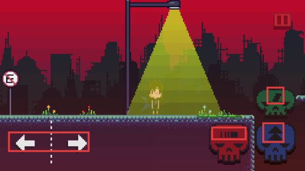 2、操控角色,利用左右箭头移动,左下方的蓝色骷髅头是【跳跃】按键,红色骷髅头是【攻击】按键,绿色骷髅头是【滑铲】按键。