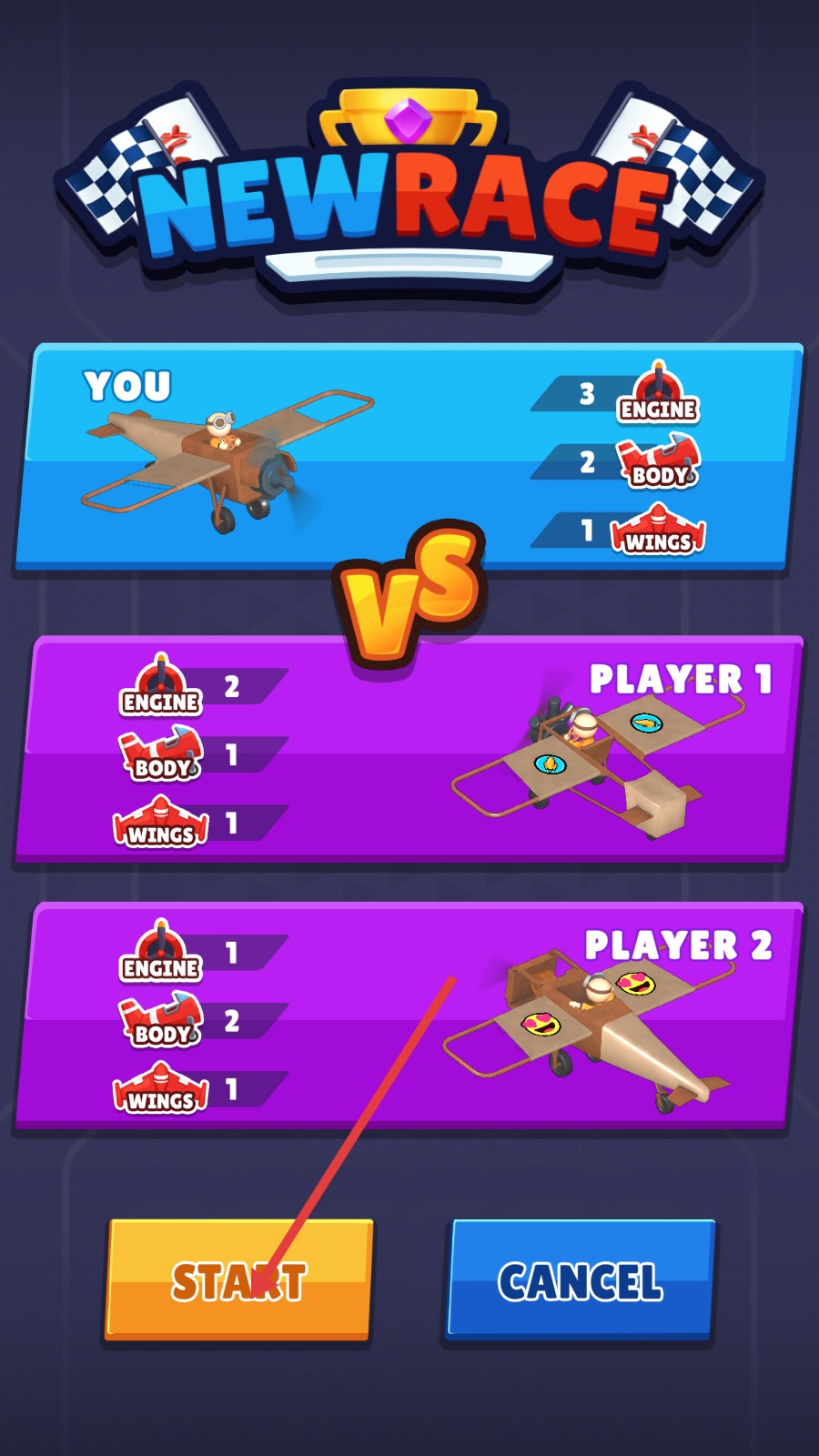 1、赛前查看飞机【ENGINE】【BODY】【WINGS】属性,点击【START】开始比赛。