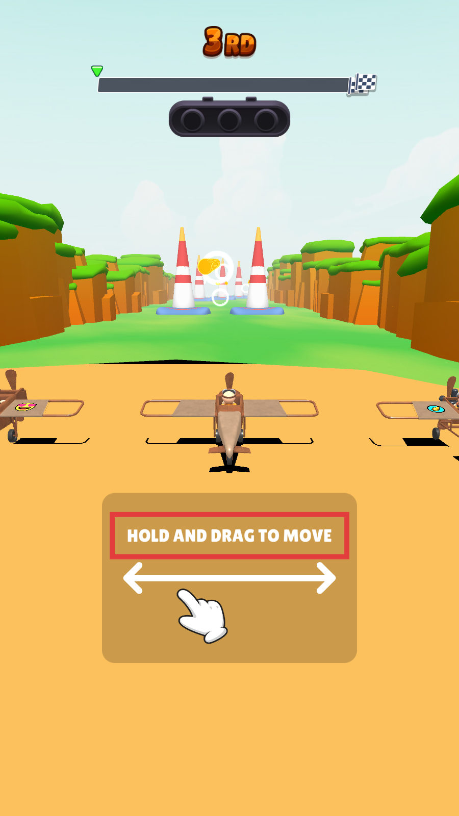 2、在赛道,按住屏幕拖动,控制飞机躲避障碍,保持飞行路线,收集路上的金币。