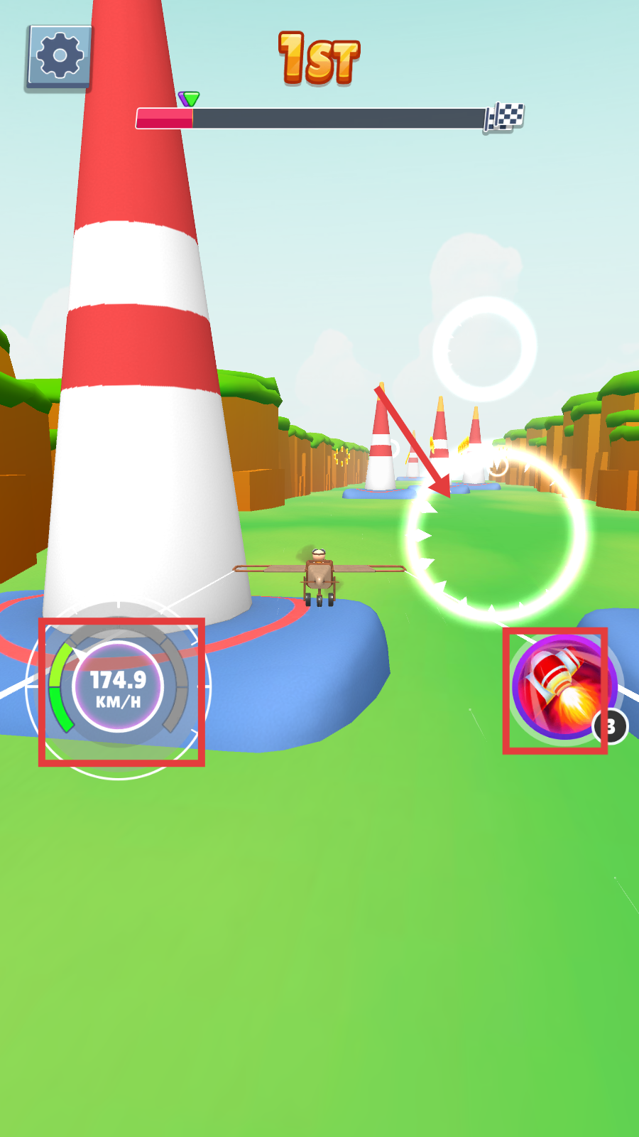 3、遇到加速道具圈,引导飞机驶入,触发加速,善用火箭技能,超车冲刺。