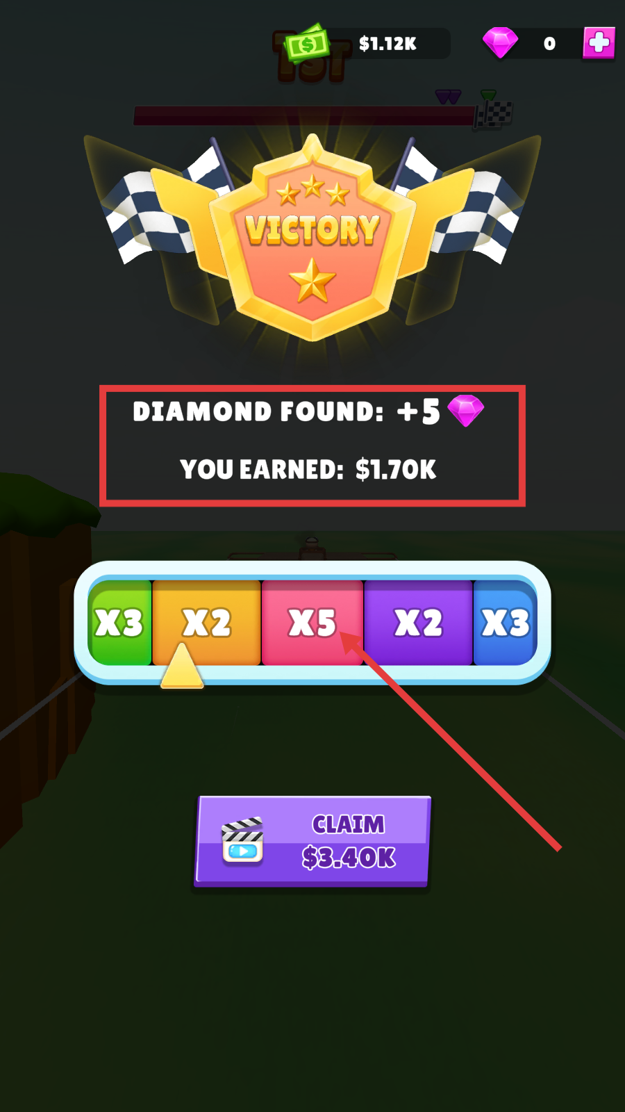 4、冲过终点,结算界面选倍数奖励,观看广告或直接领取钻石、金币,升级飞机。