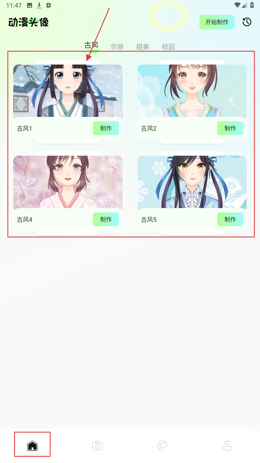 1、打开应用后,可选择【古风】等分类,点击喜欢的头像模板,如【古风1】,开启头像制作。