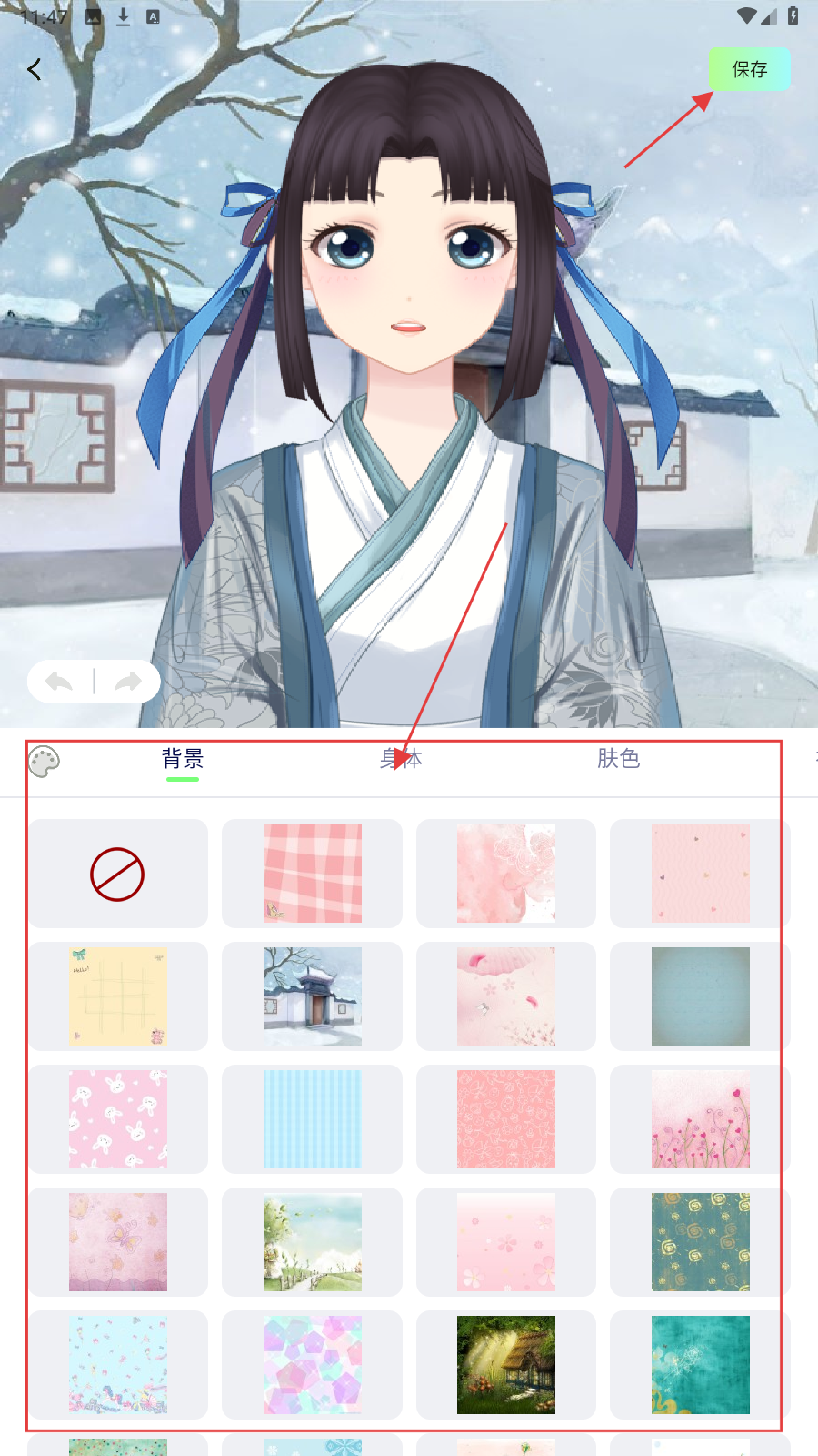 2、进入头像制作页面,可从下方选择背景、身体、肤色等元素,调整至满意后,点击右上角【保存】。