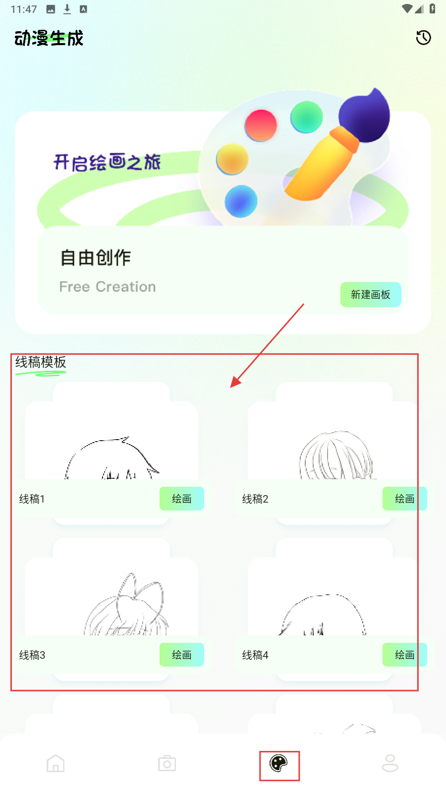 3、点击底部调色盘图标,进入【动漫生成】页面,可选择【自由创作】或线稿模板,如【线稿1】进行绘画。